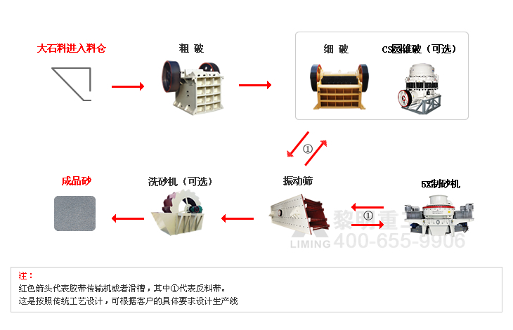 大塊石料經料倉由振動給料機均勻地送進鄂式破碎機進行粗碎,粗碎后的石料由膠帶輸送機送到反擊式破碎機進行進一步破碎,細碎后的石料由膠帶輸送機送進制砂機進行進一步細碎和整形,整形后的石料由膠帶輸送機送進振動篩進行篩分,篩分出幾種不同規格的砂石,滿足粒度要求的砂石由膠帶輸送機送進洗砂機,清洗砂石中的石粉、泥土,經脫水、分級后送往成品料堆,不滿足粒度要求的石子則由膠帶輸送機返料送到制砂機進行再次破碎、整形,形成閉路多次循環。